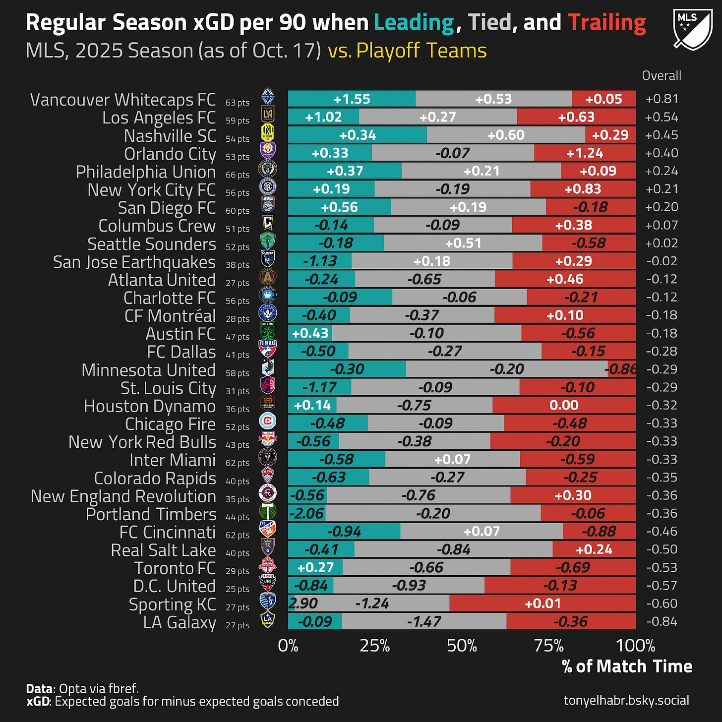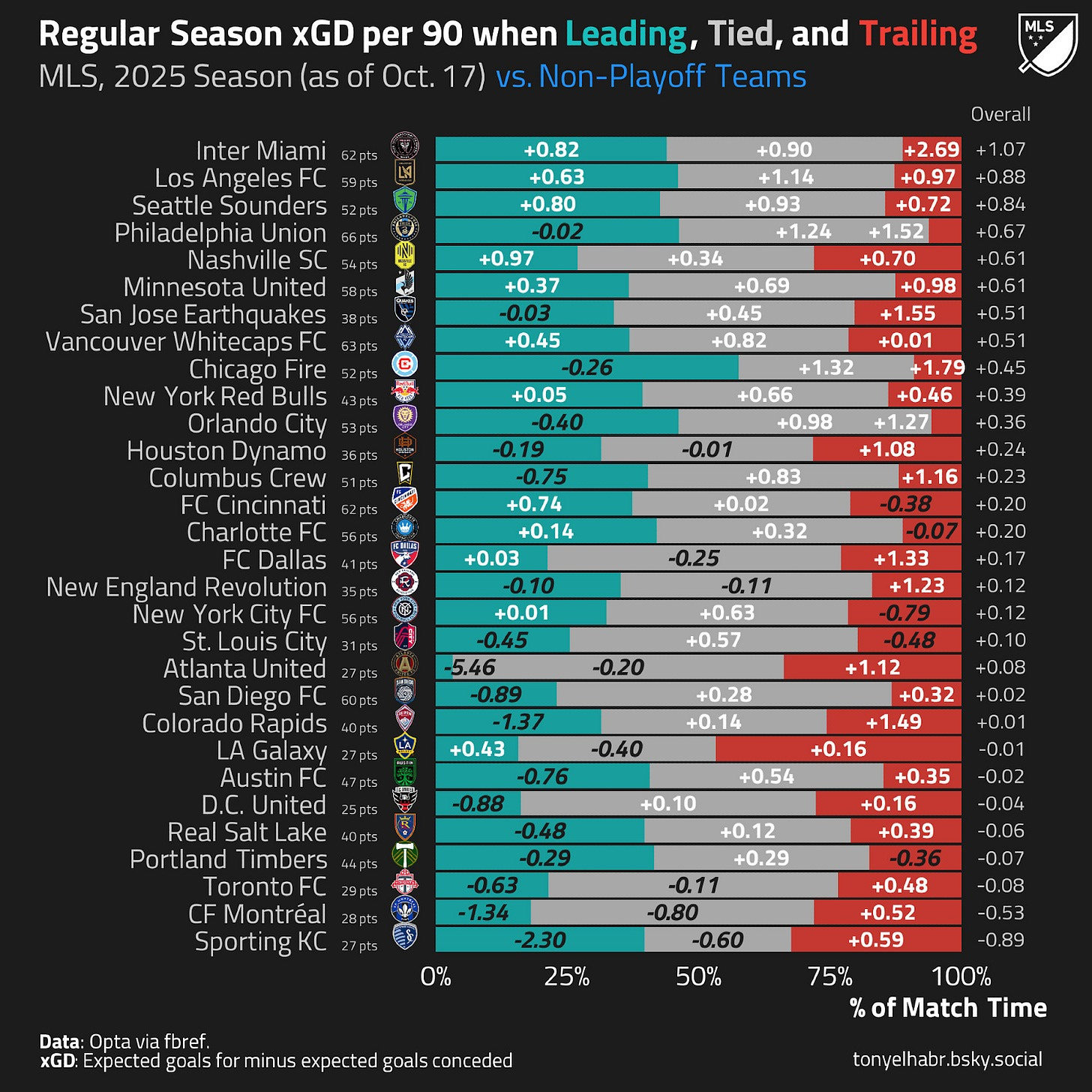 You also have to consider that this team spent *a lot* of time playing from behind. In even game states, Atlanta United’s average expected goal differential was -0.29, the fourth-worst mark in the league. They were able to do a decent job of piling on xG when they were chasing the game, but, again, it can’t be understated that they were behind like literally all the time. Check these charts from Tony ElHabr on BlueSky.