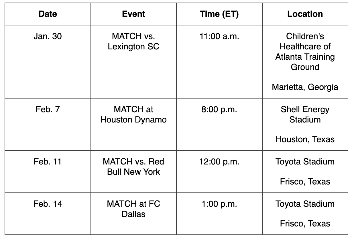 Atlanta begins preseason Saturday, Jan. 10 with the first open training session to media on Monday, Jan. 12 at the Children’s Healthcare of Atlanta Training Ground.