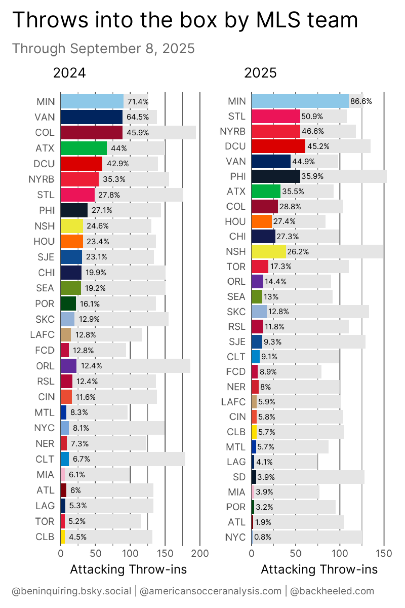 Teams around the league are taking notice. Back in May, the good folks at Backheeled found that long throws into the box were trending upward at a notable rate and that teams were having more success with long throws than ever. Minnesota, of course, are leading the way. But they aren’t the only ones adopting what’s becoming a global trend in the sport. Teams like New York, Vancouver, St. Louis and Philadelphia are all invested in the long throw.