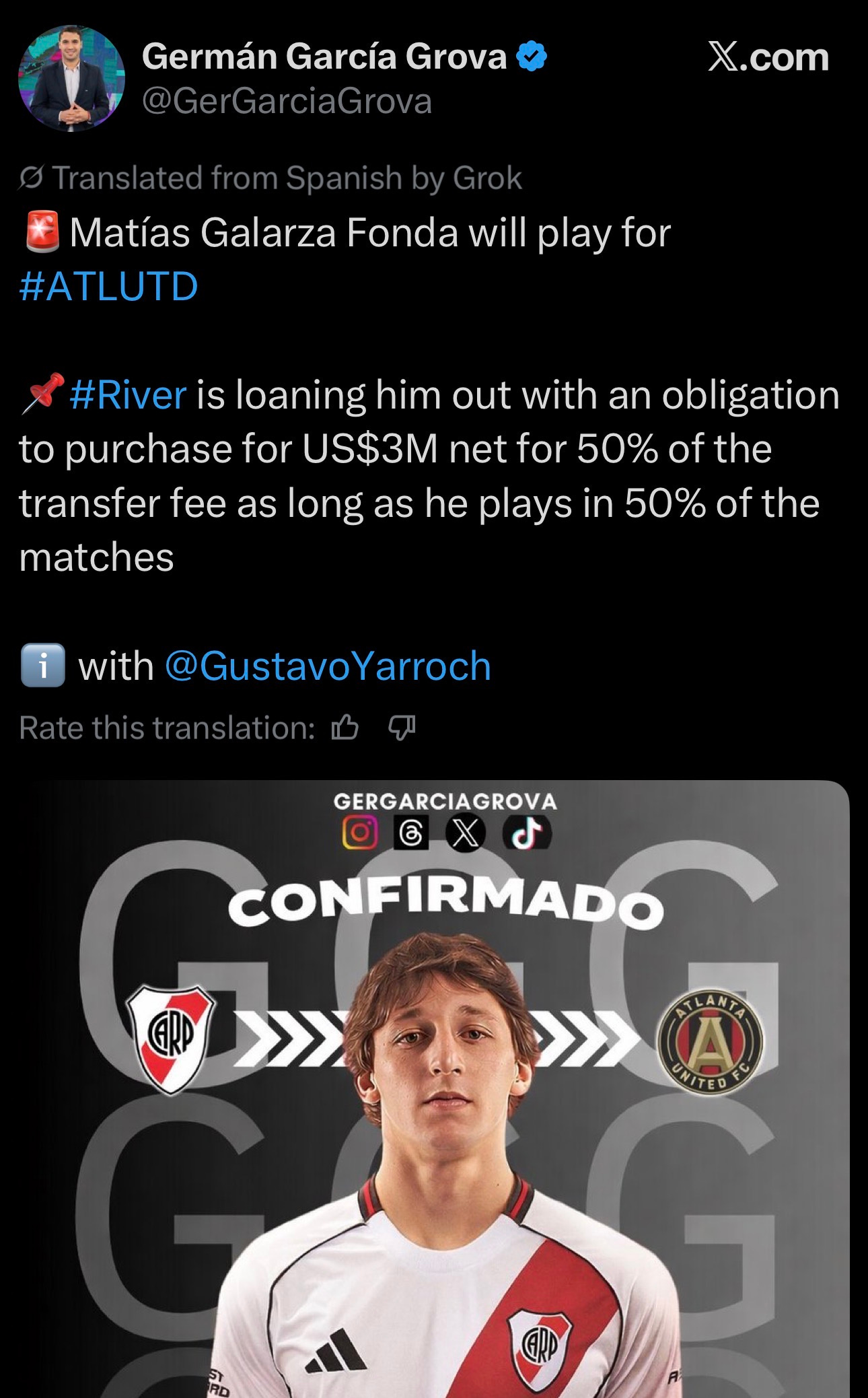 Supposedly the deal will include a clause that automatically triggers a $3 million purchase option if Galarza Fonda appears in 50 percent of the matches he’s eligible to play in for Atlanta during the length of the loan.
