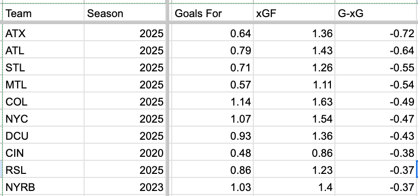 Anyway, just going to point out that even if 2025 Atlanta United were converting chances at a more consistent rate, the underlying numbers still wouldn’t be expecting much. They’re sitting at a totally mediocre 1.24 expected points per game based on the chances they’ve created and allowed. That’s definitely more salvageable than 0.79 and, yeah, you never know what would happen with a different game state or two, but a regression to the mean isn’t going to turn them into a juggernaut.