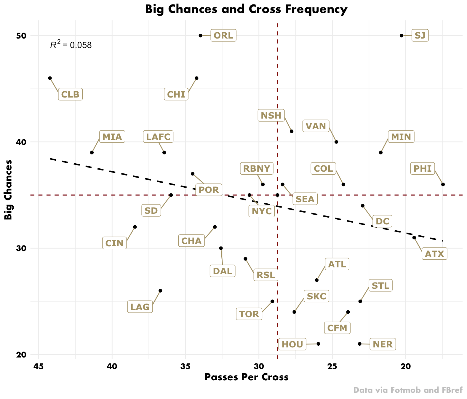 Unsurprisingly, teams that get stuck relying on crosses typically generate slightly fewer big chances.