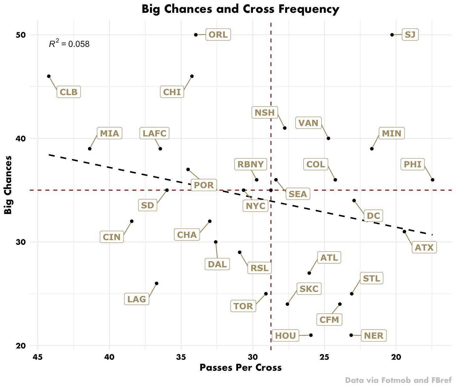 Those are total numbers. If we look at how frequently they’re crossing the ball, they’re still toward the middle of the pack. The Five Stripes average 474.3 open-play passes per game. That means they play a cross about every 26 passes.