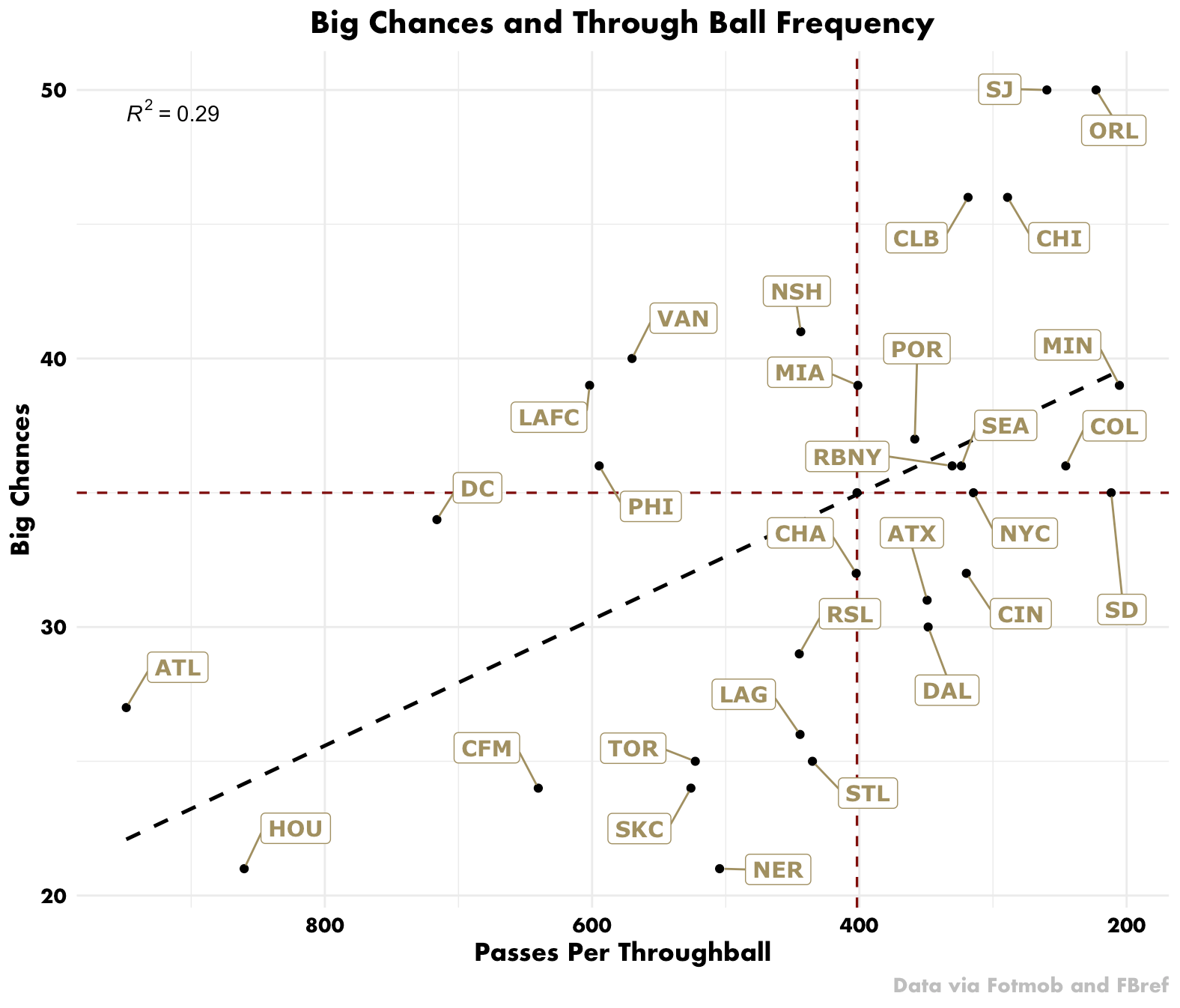 Unsurprisingly, the teams that complete through balls more frequently generate big chances way more often.