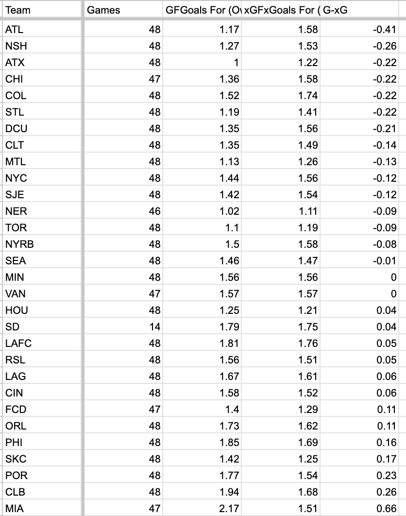 But, also…they might just be kind of bad at finishing. Over 48 games in the last two seasons, they’ve generated 1.58 xG per game and scored just 1.17 goals per game. That’s the worst mark in the league over that span by a significant margin. Finishing is only barely real if it’s real at all, but when the numbers are this stark with this large a sample size, it makes you question if Atlanta is just hilariously unlucky or if there’s an added skill penalty coming into play here.