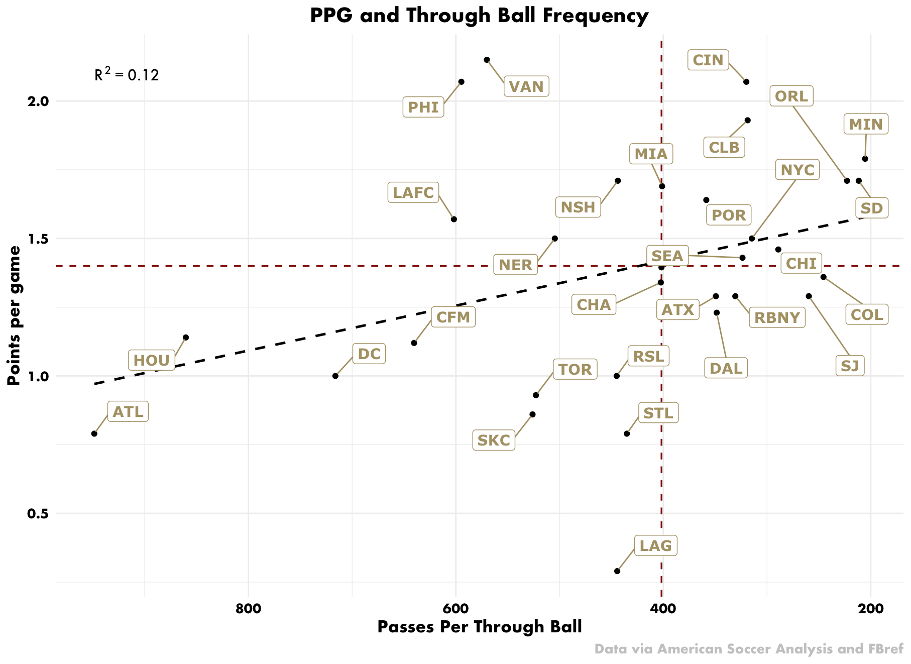That’s notable for a couple of reasons. First and foremost, the data shows that through balls lead to the highest quality chances (aka the chances most likely to end up in the back of the net). Second and funniest/bleakest, Atlanta predicated their whole offseason on finding players who would make runs in behind for Alexey Miranchuk.