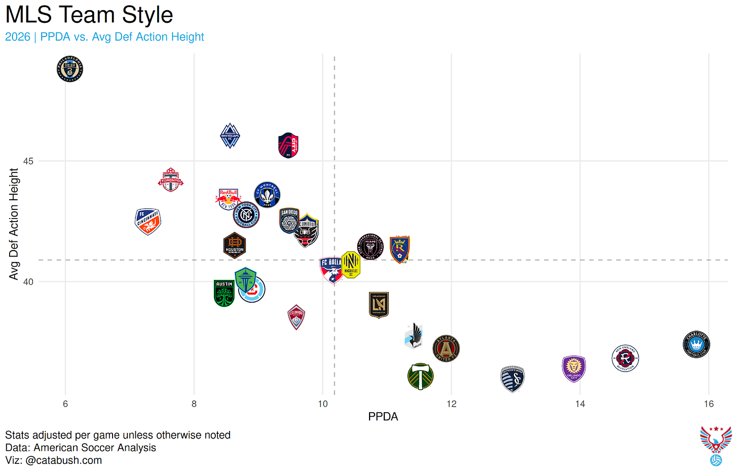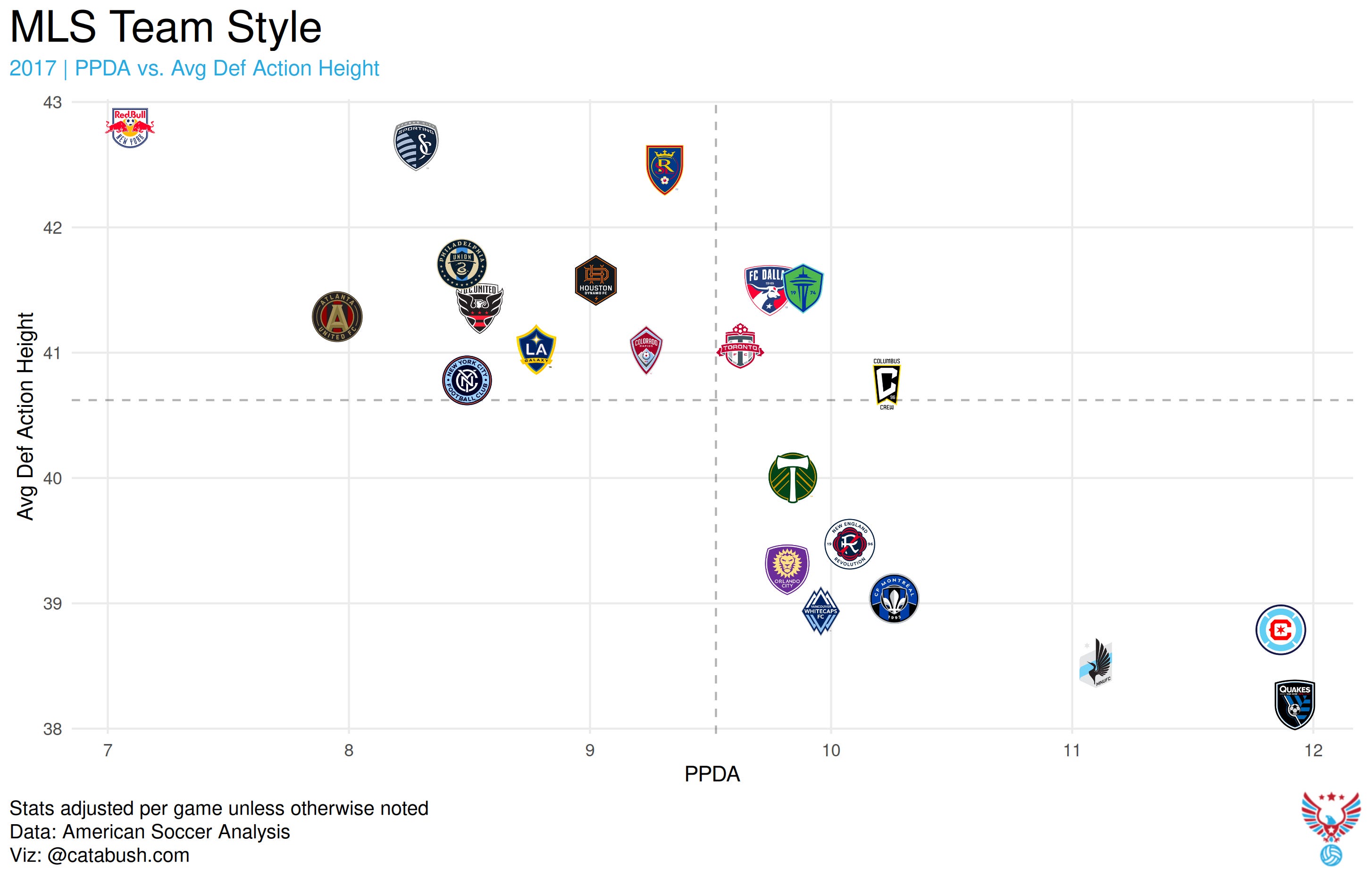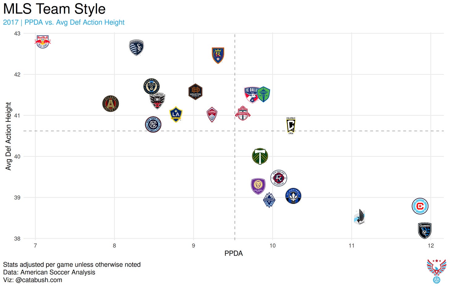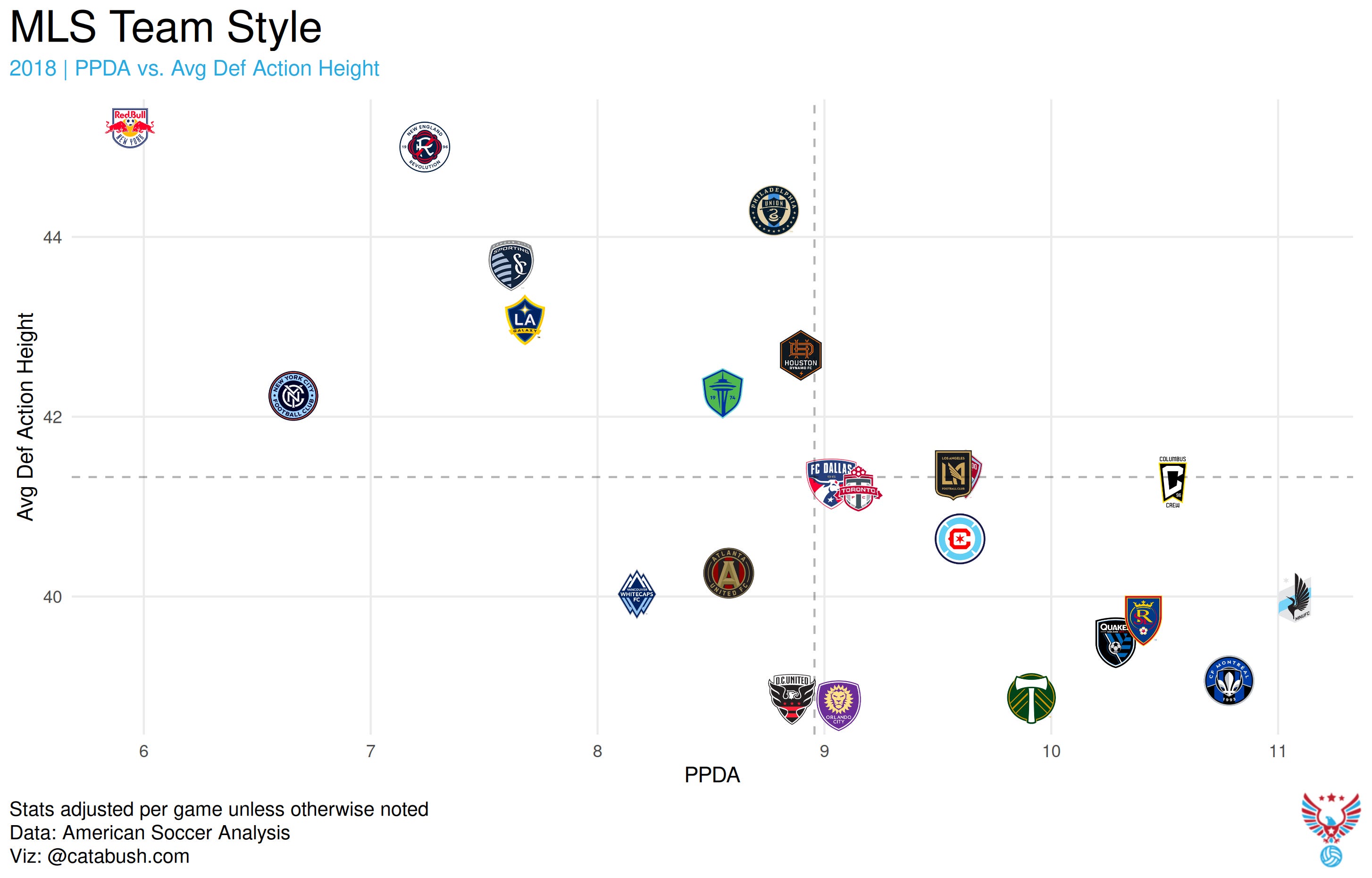 If you check the scale there, Atlanta’s average defensive action height and PPDA only dropped a little, even if their place on the chart relative to the rest of the league shifted. Both 2017 and 2018 Atlanta United were in far different places from 2026 when it comes to pressing.