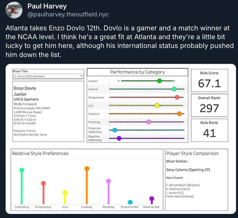With that 12th pick, Atlanta went ahead and took Enzo Dovlo from UNC Greensboro. Dovlo is a winger who scored 10 goals and delivered eight assists in 23 games this season. He also recently won the USL League Two title with Vermont Green FC. Most importantly, people who are actually invested in college soccer and MLS seem to be impressed by this pick.