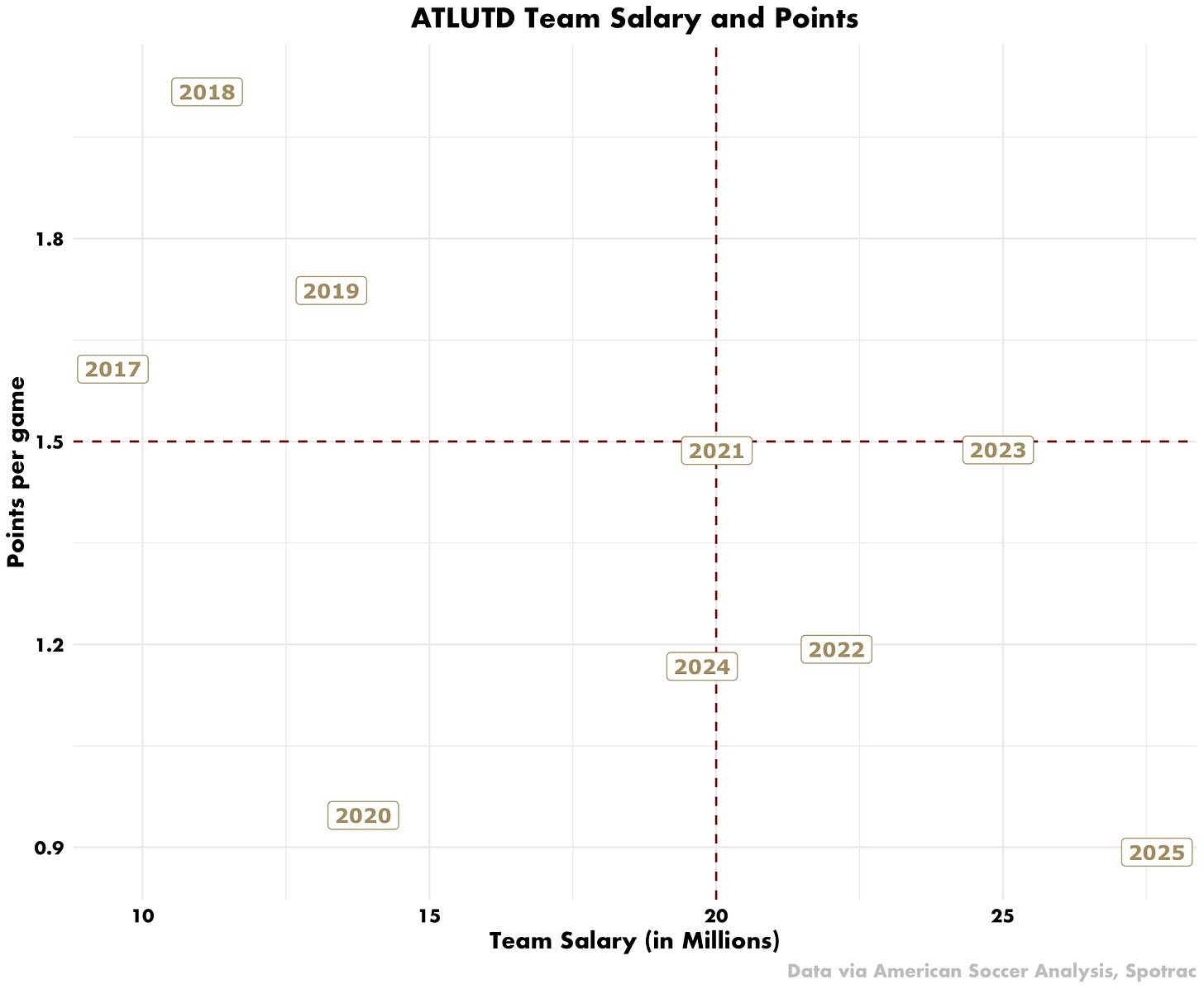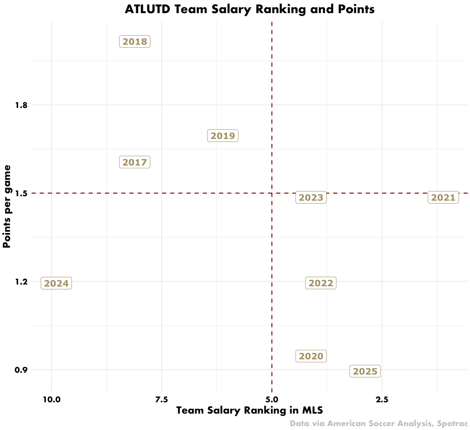 Keep in mind, this is largely a reflection of DP spend by team. But, still, that’s a lot of money to throw down to get these kinds of results. Per Spotrac, 2025 is just the second time in club history Atlanta has ranked in the top three in total salary.