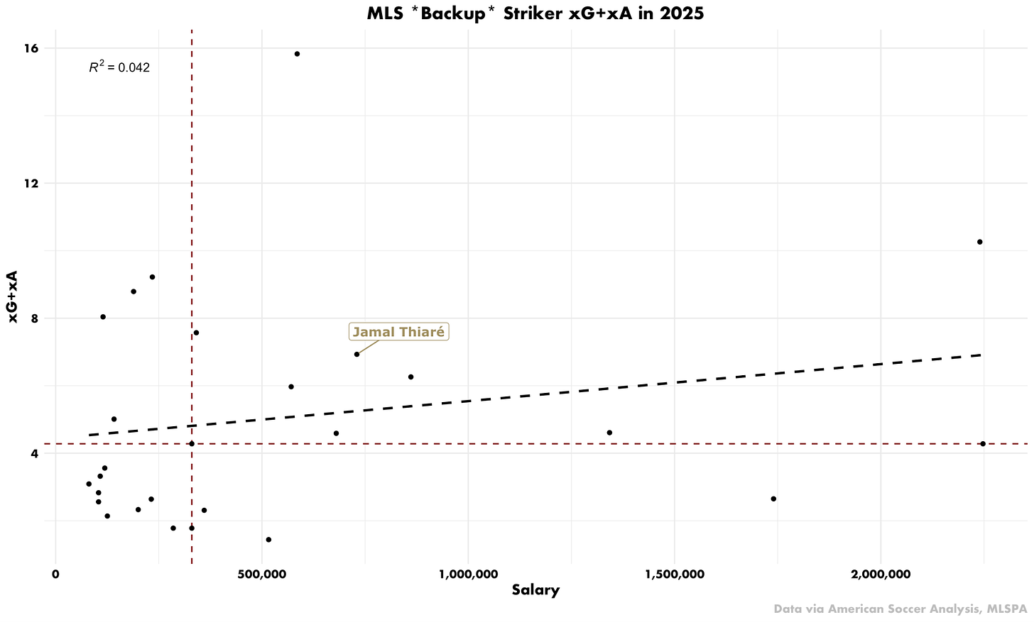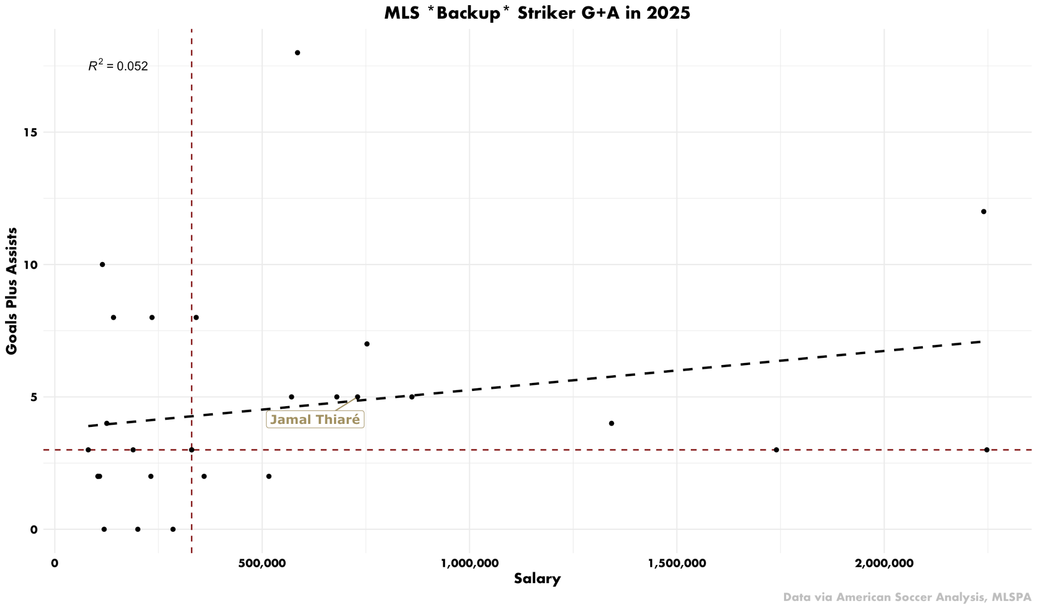 Unsurprisingly, he looks a little better among backups. There are definitely more valuable players—Seattle’s Danny Musovski started 16 games and scored 14 times with four assists if you’re wondering who the top left outlier is—but Thiaré’s place among his peers suggests Atlanta isn’t setting money on fire by keeping him around.