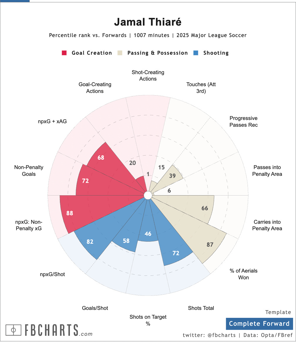 Remember, this chart is looking at per 90 stats for a player who made 19 appearances as a substitute this year. The stats are going to be a bit inflated. They do seem to line up relatively well with the eye test, though. Keeping in mind our normal caveats about how being on a terrible team like 2025 Atlanta United can make a player look worse than they actually are, Thiaré stayed active, made consistent threatening runs and, oftentimes, looked a little more dangerous in Ronny Deila’s system than Latte Lath. He’s got a great physical skillset and a high motor. To me, it’s easily apparent why Tata and Atlanta feel like they can get solid performances out of him in 2026.