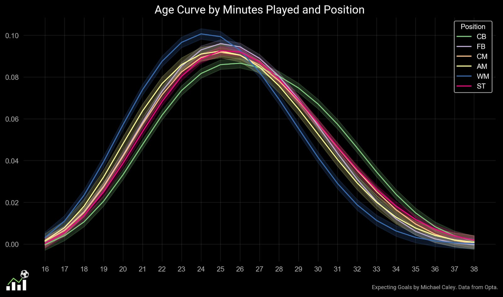 Michael Caley has been conducting research on soccer aging curves. You might remember we talked about this when we were slightly panicking about the Miguel Almirón signing. A key conclusion from his work is that wingers burn earlier and shorter. He dives deep into that here, but this chart does a decent job of summing things up.