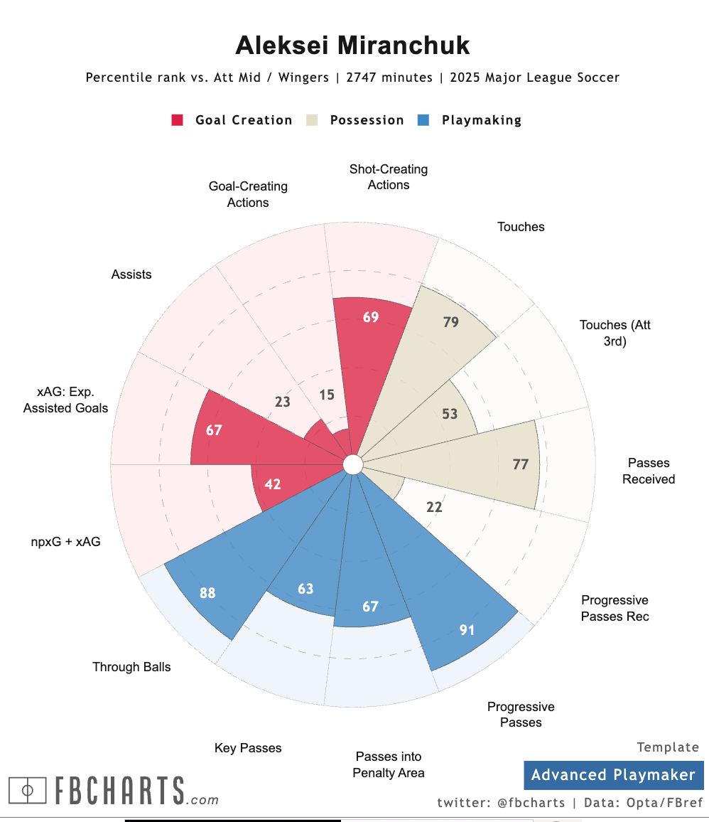 That’s not the worst radar you’ve ever seen. However, there’s a big chunk missing that lines up directly with the eye test (sans rose colored glasses). Miranchuk’s chance creation numbers and end product weren’t up to the standards of a $13 million No. 10. That’s especially true when you consider Miranchuk had a few months to get settled in MLS before this season and that the club spent the offseason talking about how their roster decisions were predicated on giving Miranchuk teammates he could play in behind. Producing only three primary assists in that context, like most things from this year, is bad.