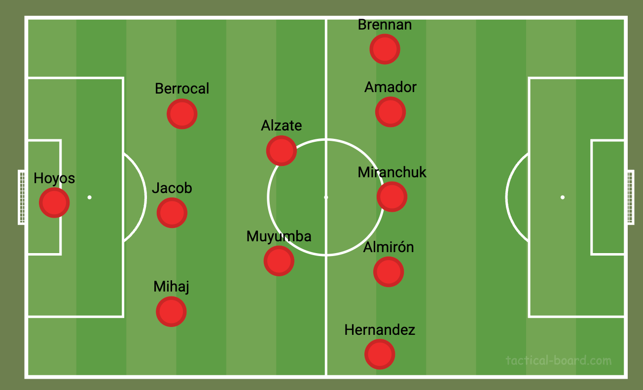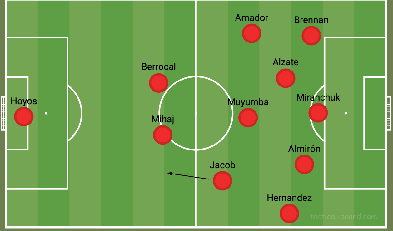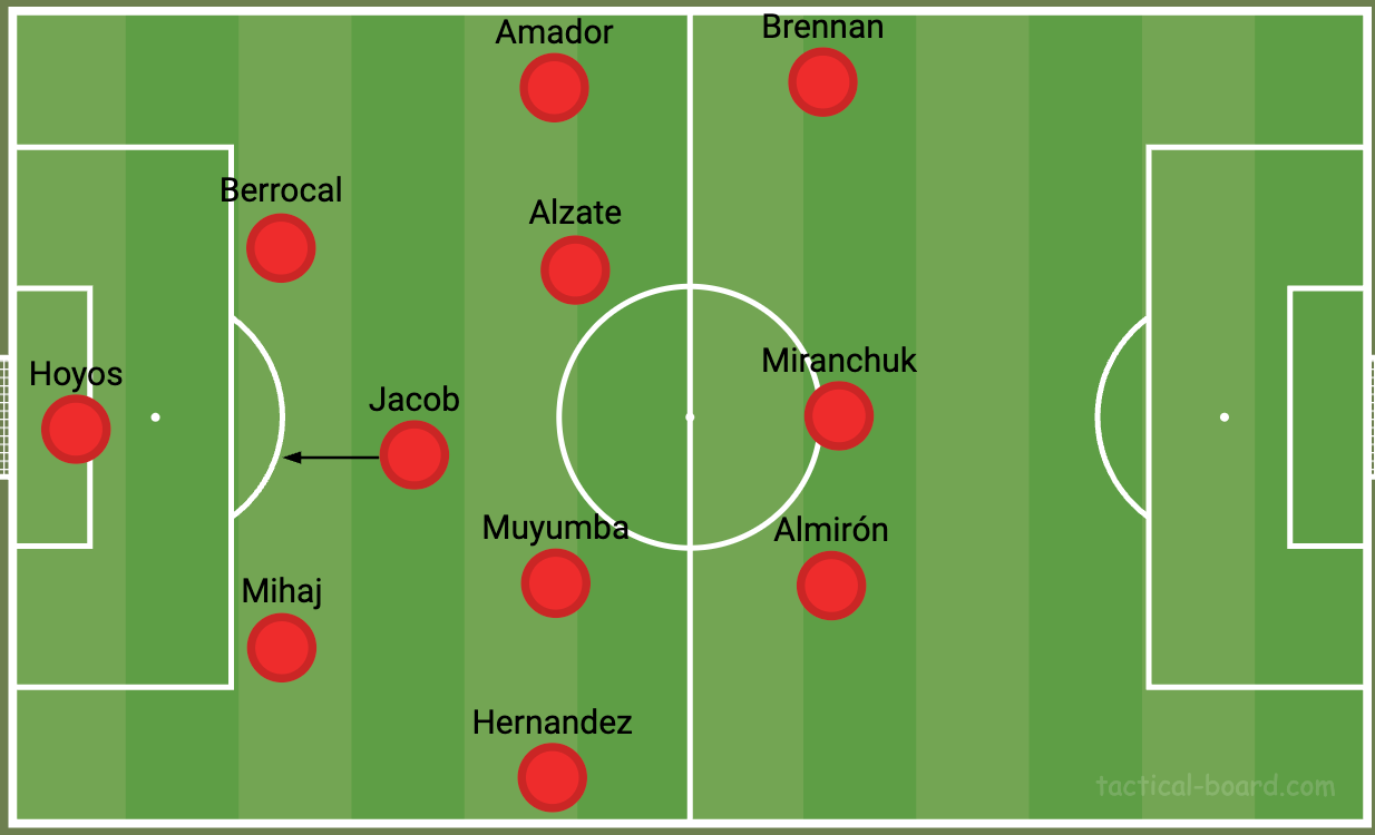 It’s also notable that Amador usually dropped a bit into that middle line of three while Steven Alzate progressed toward the penalty area. Amador and Jacob give you a little more protection out wide as teams try to counter, and rotation of Amador and Alzate gives the back line a little more to think about.