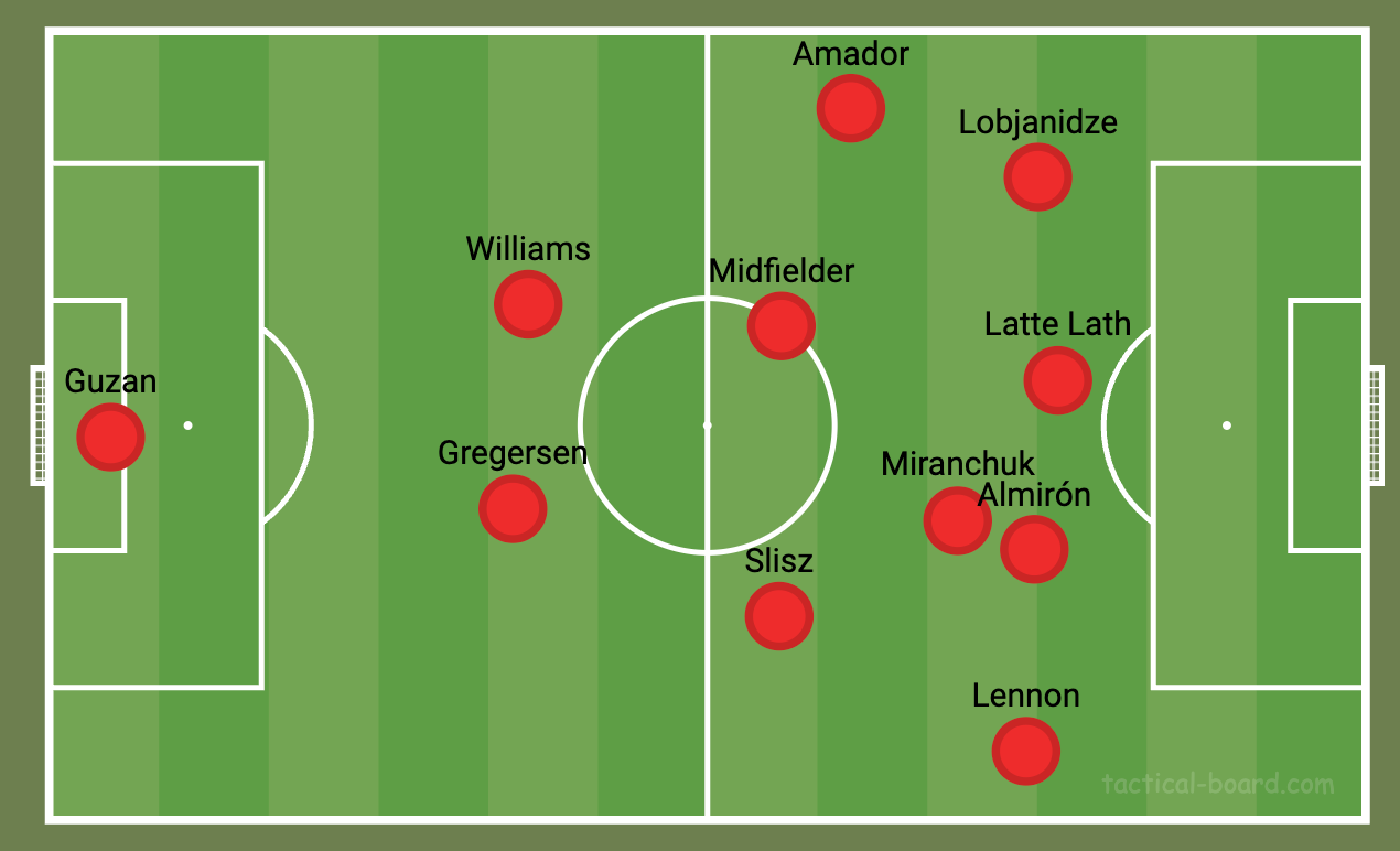 Basically, still in that 2-4-1-3 except Lennon is more advanced. Pretty much everyone has gone in a vertical line from buildup to attack. Again, I don’t think teams were stressing too much defensively here. Yeah, maybe at the start there would be some interesting rotations between Miranchuk and Almirón but that certainly didn’t continue. And it definitely didn’t force the opponent into many difficult decisions.
