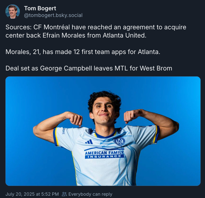 It’s unclear what kind of return Atlanta United will get for Morales. Although the deal is oddly similar to Atlanta’s 2022 trade with Montréal that sent homegrown center back George Campbell away for $600k in GAM. You can likely expect a similar exchange here.