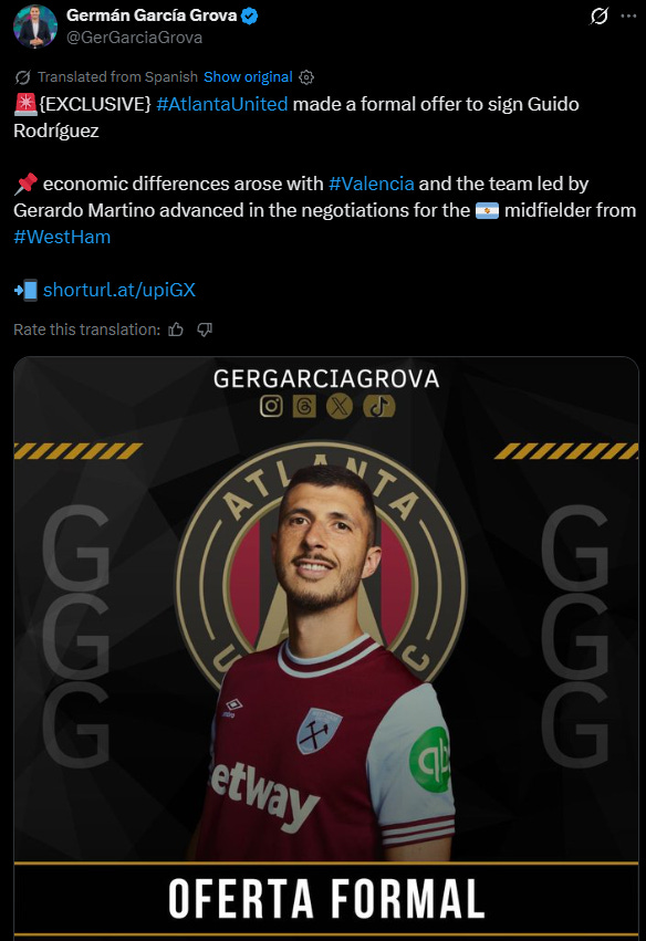 He says that Atlanta have made an official offer to sign Guido Rodríguez from West Ham.